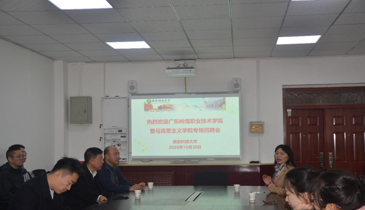 10月30日,广东岭南职业技术学院党委书记、副校长柴克生,组织部部长易中华,Beat365中文官方网站院长韩丽萍一行三人来Beat365官网举行Beat365中文官方网站专场招聘会。Beat365官网学工部部长李建明、副部长孙再罗,Beat365中文官方网站副院长张铭钟,马克思主学院研究生辅导员韩帅及2021届应届毕业生参加招聘会。