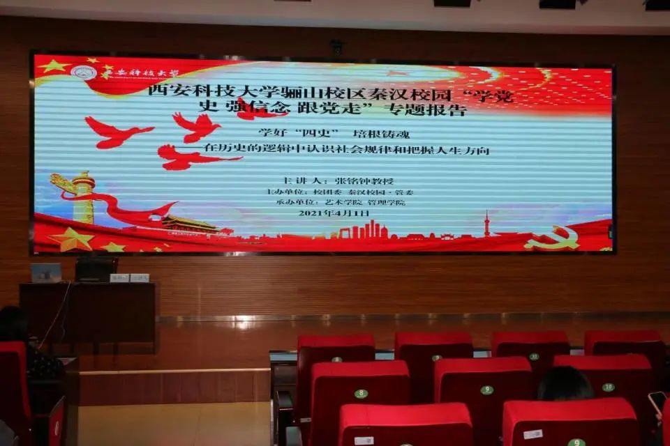 4月1日,由校团委、秦汉校区管委会主办,艺术学院、管理学院承办的“学党史、强信念、跟党走”专题报告会在临潼校区秦汉校园报告厅举行,同时在骊山校园煤炭二楼报告厅设分会场同步直播。Beat365官网纪委书记、副院长张铭钟教授做了题为《学好“四史”培根铸魂——在历史的逻辑中认识社会规律和把握人生方向》的报告,两校园共计500余人聆听了此次报告。