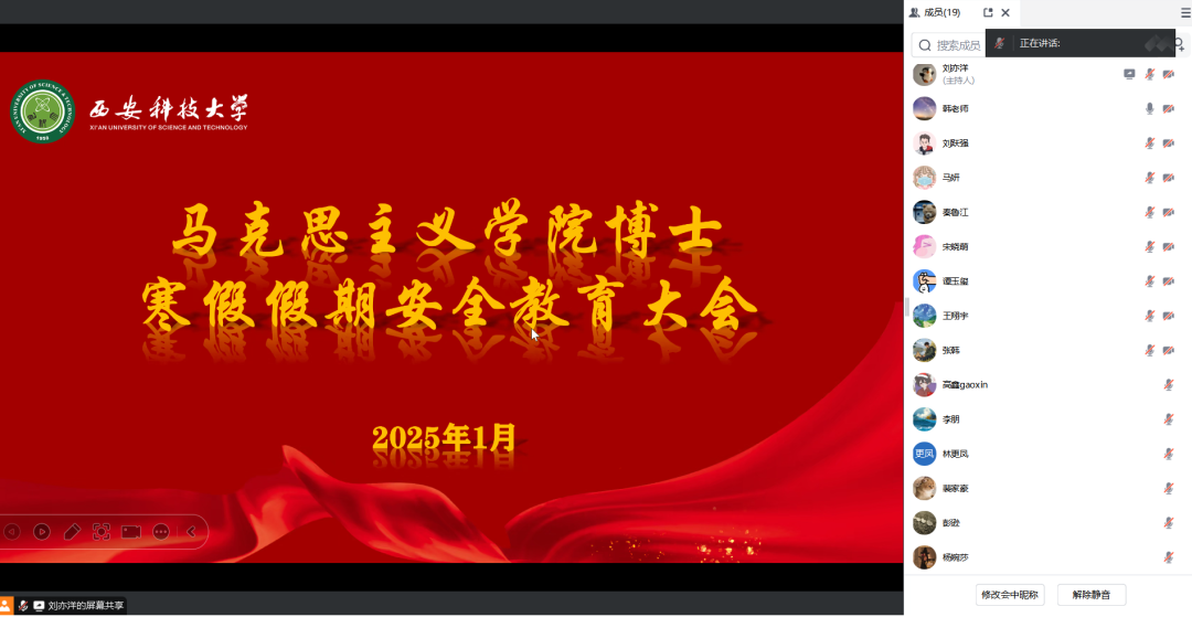 会议伊始,韩帅领学了学校《关于做好2025年寒假研究生教育管理相关工作的通知》〔研工函(2025)1号〕和《关于做好2025年元旦假期和寒假学生安全教育管理服务工作的通知》〔学工函(2024)57号〕文件内容,重点围绕消防安全、交通安全、食品安全、网络安全、实习求职安全、防范电信诈骗等多个方面进行了强调。