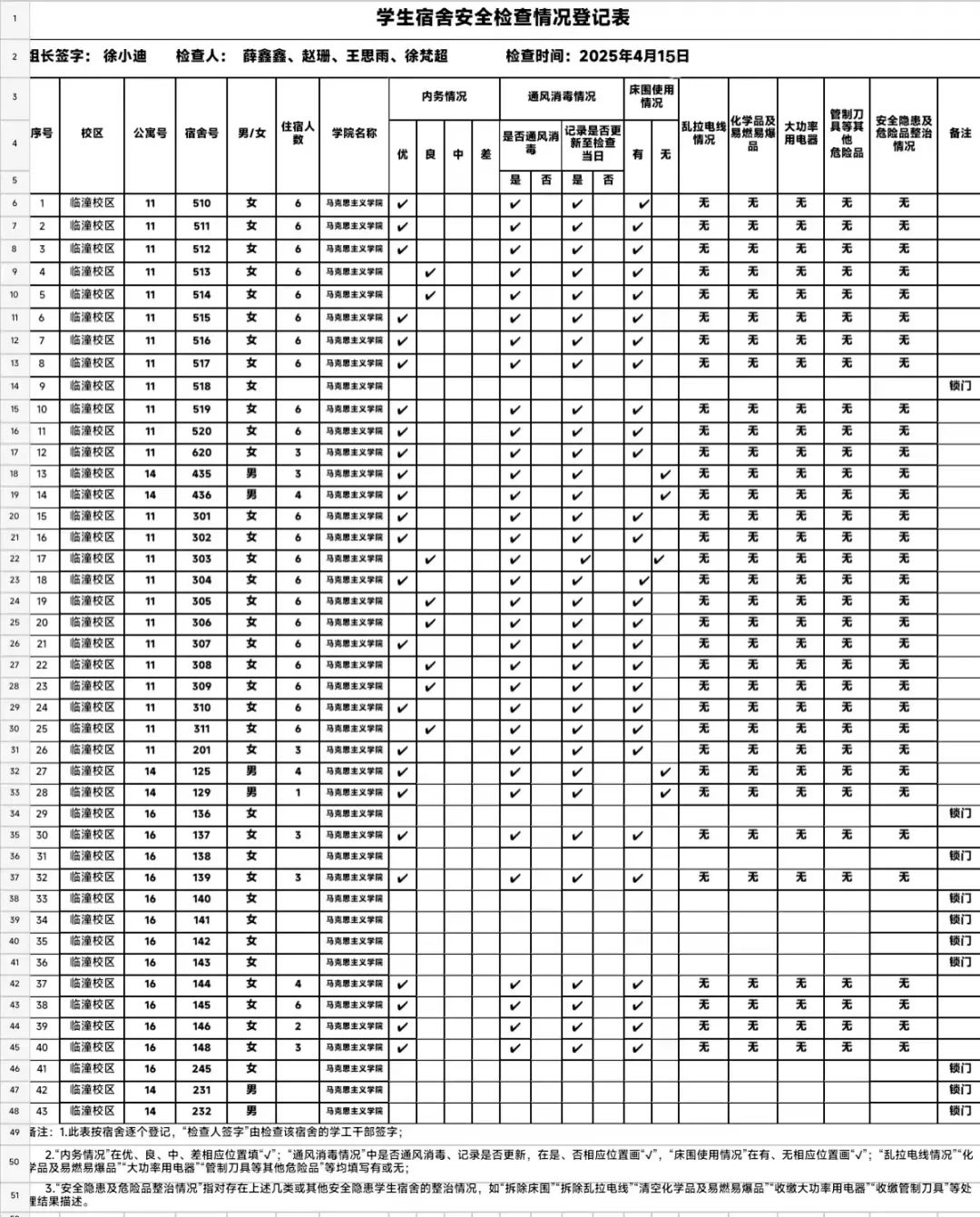 本次检查覆盖全院43间宿舍,重点检查宿舍卫生环境及安全隐患,着重排查桌面床面杂乱、门口垃圾堆积、违规用电等问题。学生干部详细记录各宿舍情况,对问题宿舍现场提出整改意见,检查结束后于一站式学生社区集中研讨。结果表明,多数宿舍卫生良好,电器使用规范,其中,25间宿舍内务优秀,但部分宿舍存在桌面床面不整、门口有垃圾现象。后续,学院将安排辅导员和学生干部强化检查,督促整改,营造良好宿舍环境。