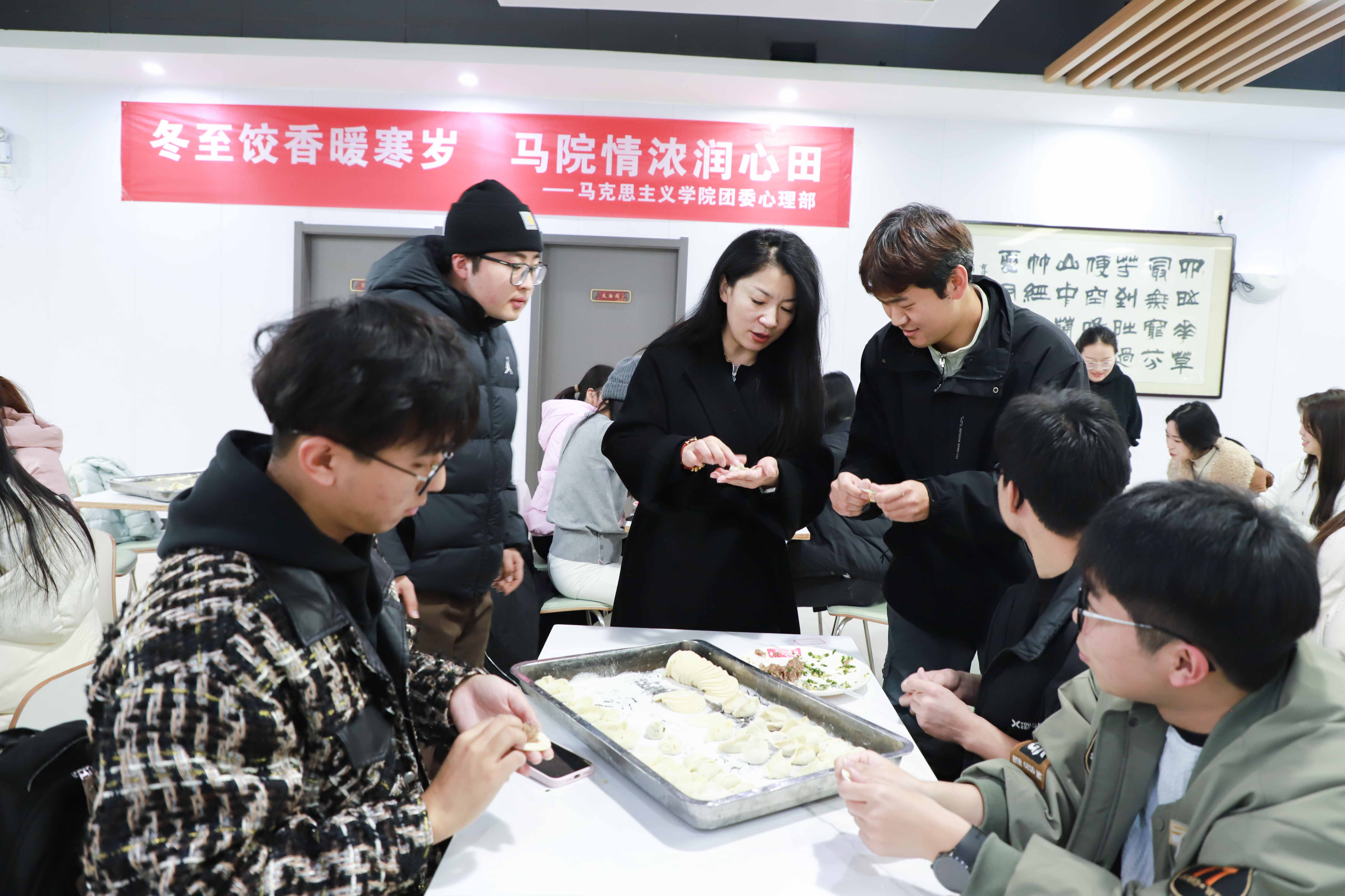 12月21日下午,Beat365中文官方网站团委心理部在骊绣苑食堂三楼举办了“冬至饺香暖寒岁,马院情浓润心田”主题包饺子活动,学工办主任、团委书记李超,全体在校研究生参与,共赴一场暖冬之约,在欢声笑语中庆祝冬至佳节。
