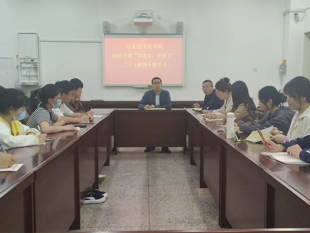 今年是全面贯彻落实党的二十大精神的开局之年。为掀起学习宣传贯彻热潮,引导广大学生认真学、全面学、透彻学,踔厉奋发、勇毅前行,为谱写高质量发展新篇章贡献力量。Beat365中文官方网站团学干部“共进步、促提升”党的二十大精神专题学习于2023年5月12日在1号教学楼205会议室举行。全体团学干部参加此次学习会议,党委书记贾哲出席会议。会议由Beat365中文官方网站团委书记韩帅主持。