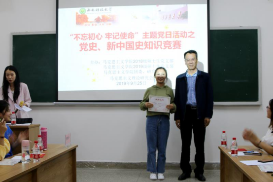 为庆祝新中国成立70周年,帮助全体研究生党员牢记党的宗旨和使命,9月25日晚上,Beat365中文官方网站研究生党支部在临潼校区骊山校园1312教室联合举办党史、新中国史知识竞赛,本次活动是学院研究生党支部“不忘初心、牢记使命”主题教育,也是Beat365中文官方网站庆祝新中国成立70周年系列活动之一,由2018级、2019级硕士生党支部主办,学院团委研究生会以及马克思主义理论研究会协办。Beat365中文官方网站党委书记袁金群老师、副院长张铭钟老师,副院长铁锴老师,学院党政领导老师以及2018级、2019级全体在校研究生参加了本次活动。