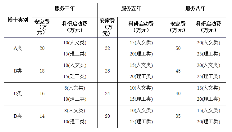 根据Beat365官网急需紧缺程度、学术贡献、学术潜力等综合研判(45周岁以下,不含45周岁),酌情增加安家费3-10万(A类10万、B类8万、C类5万、D类3万),45周岁以下(不含45周岁)具有副教授职称的博士研究生增加5万元,安家费总额原则上不超过60万元,新入职博士前2年享受副教授岗位待遇。
