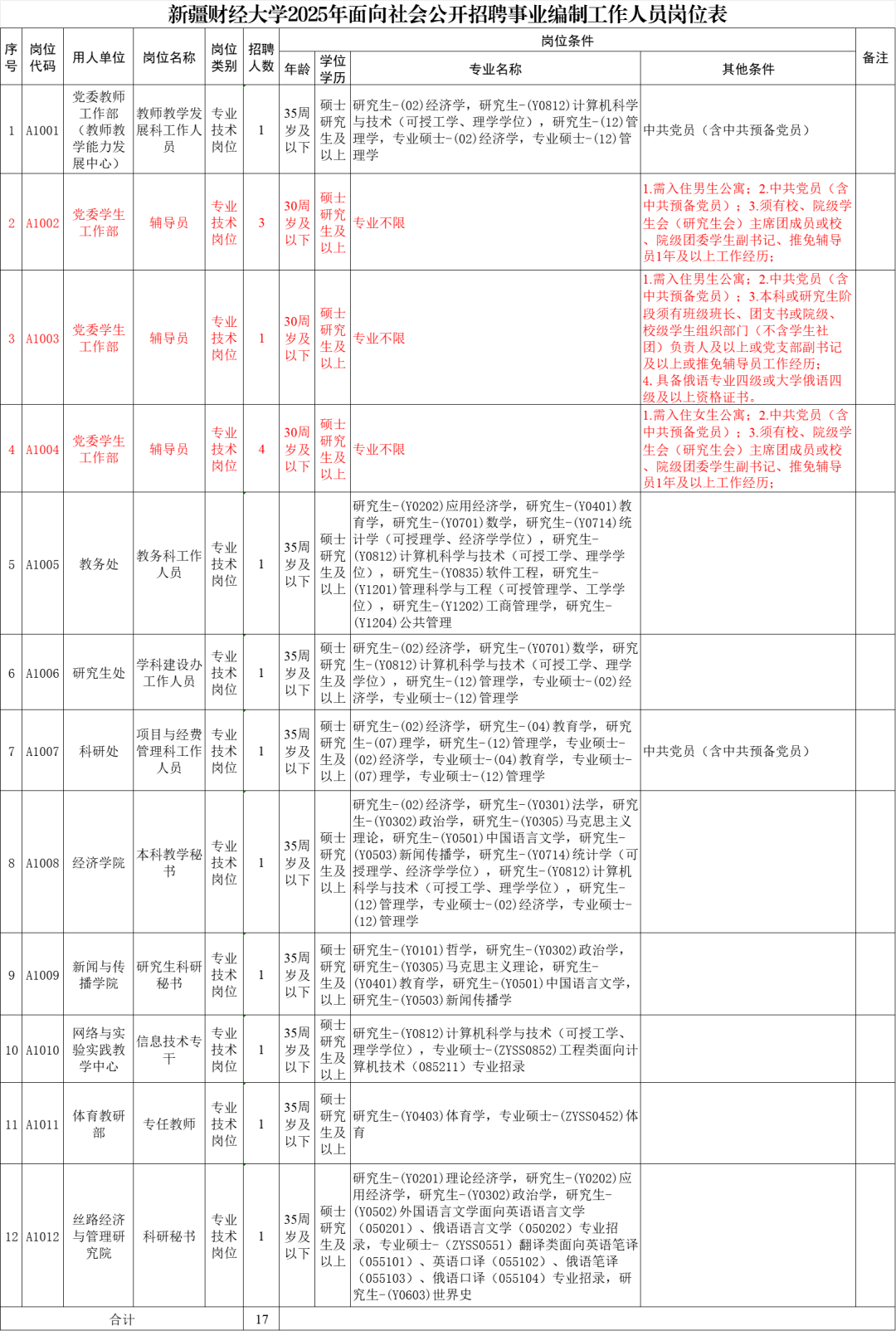 根据《事业单位人事管理条例》(国务院令第652号)和《自治区事业单位面向社会公开招聘工作人员办法》(新人社发〔2013〕141号)等有关规定,经学校党委研究,决定面向社会公开招聘事业编制工作人员17名,现将有关事宜公告如下:
