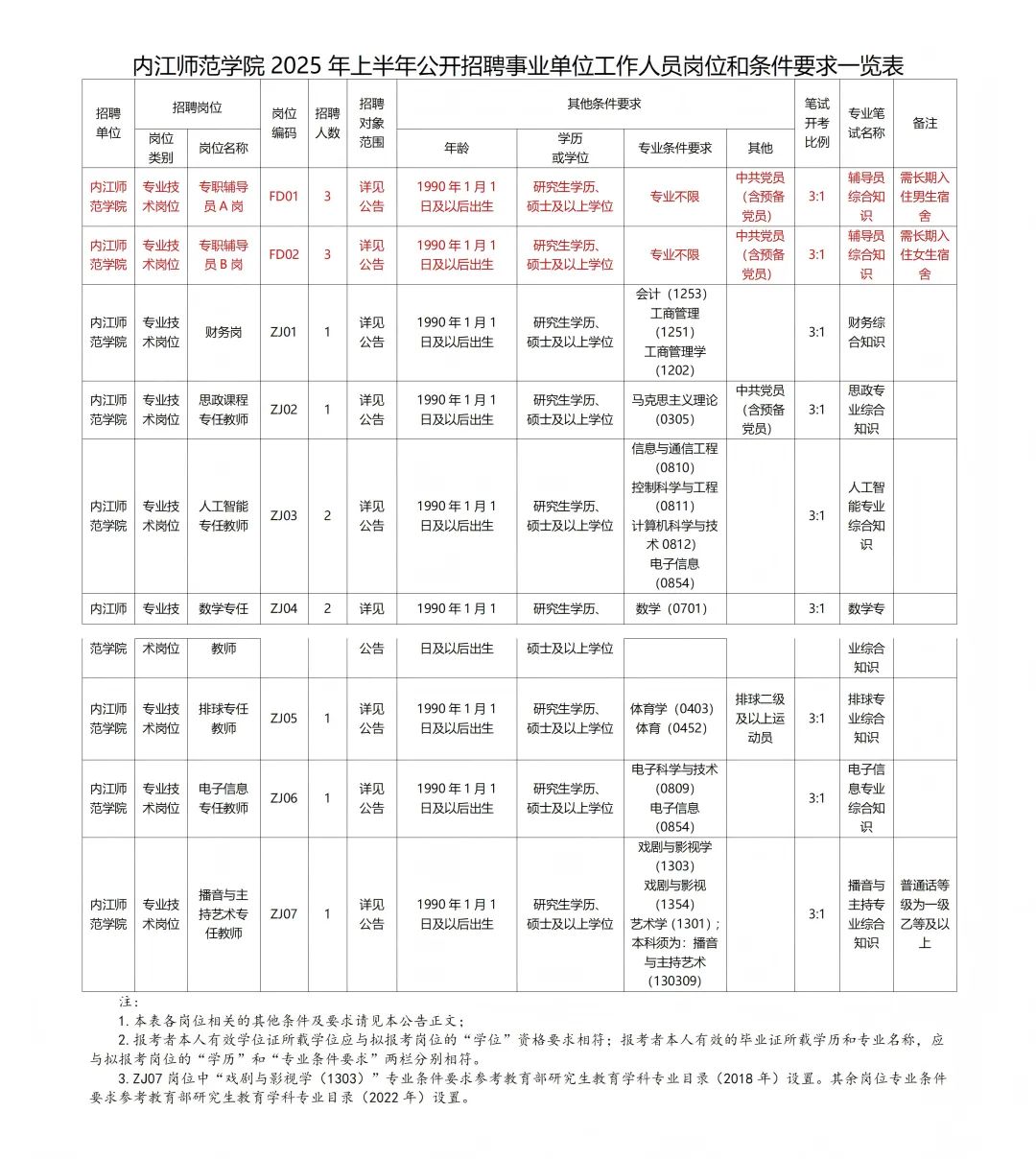 根据《事业单位人事管理条例》、《事业单位公开招聘人员暂行规定》和《四川省事业单位公开招聘工作人员实施办法》等有关规定,经四川省教育厅备案,我单位拟面向社会公开招聘15名事业单位工作人员。现将公开招聘有关事项公告如下(本公告同时在四川省人力资源和社会保障厅(以下简称省人社厅)官网[http://rst.sc.gov.cn,下同]“人事考试”专栏、省教育厅官网[http://edu.sc.gov.cn,下同]和内江师范学院网[https://www.njtc.edu.cn,下同]上发布)。