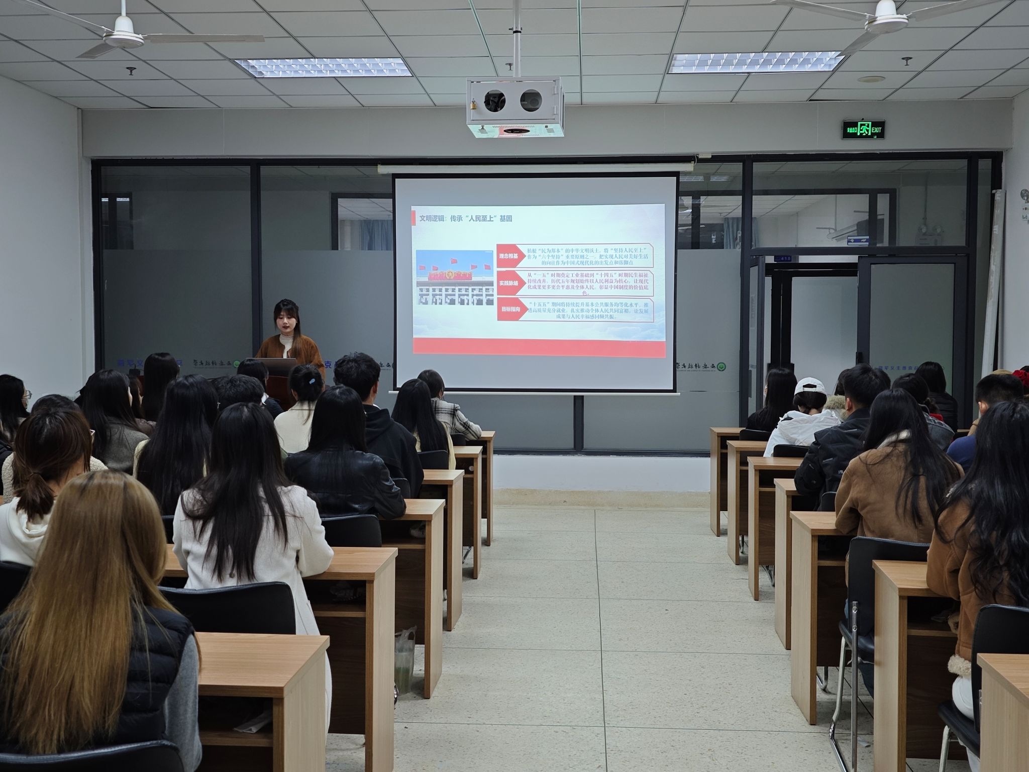 活动现场,孙心怡同学作为代表分享学习体会。她提到:在学习党的二十届四中全会精神时,我特别聚焦精神主线,从全会召开的关键历史节点入手去理解政策。分享过程中,孙心怡还谈及自己解读全会政策核心要义与时代价值的思考——她想起党领导人民一路走来的具体历程,就和大家一起回顾了从一穷二白一步步走向繁荣昌盛的足迹;面对中国共产党为什么能、马克思主义为什么行、中国特色社会主义为什么好这个核心问题,她也把自己的理解分享出来,试着和大家一起弄明白背后的历史逻辑与实践道理,希望能让在场同学对全会精神有更直观的感受。
