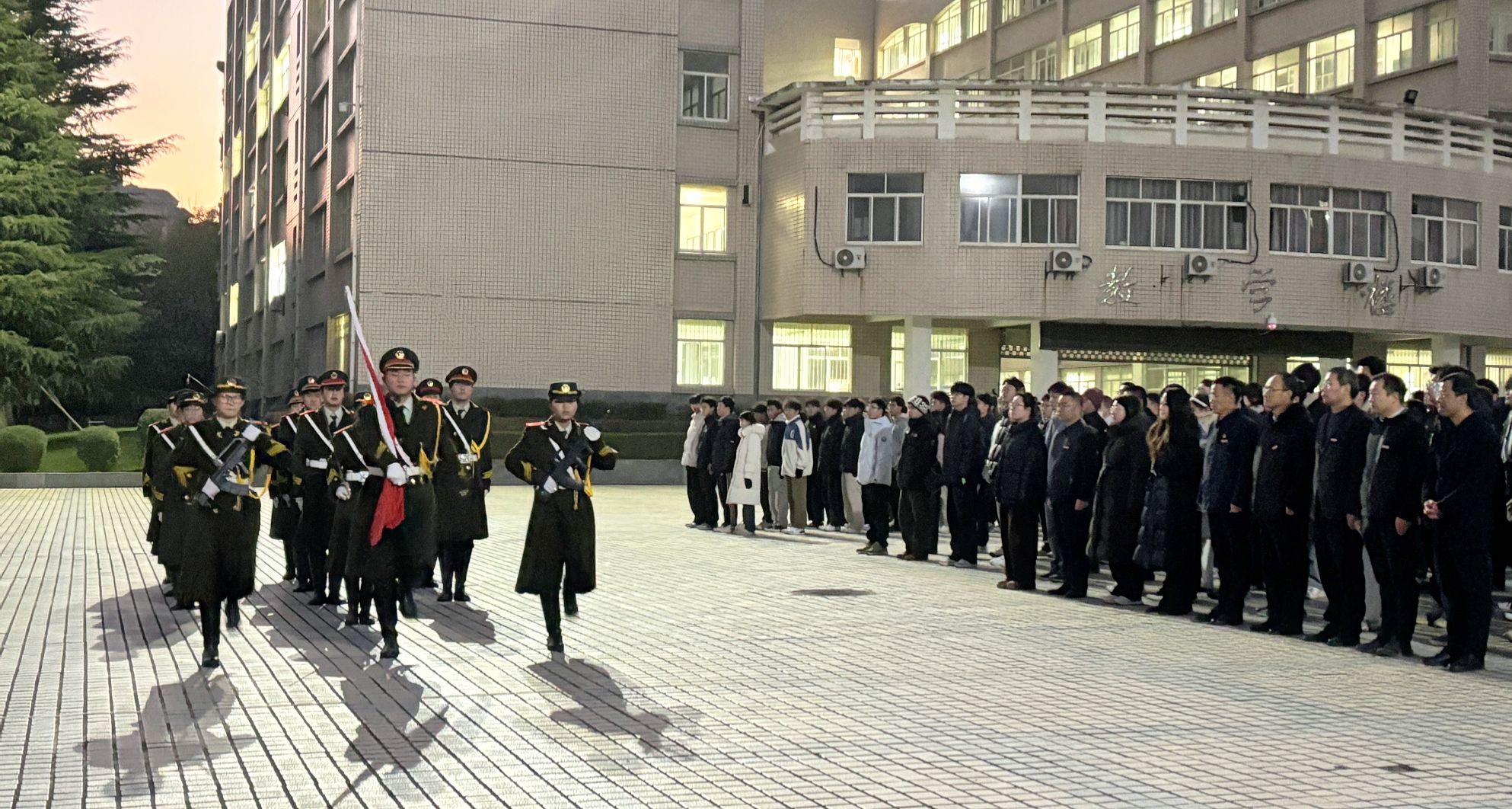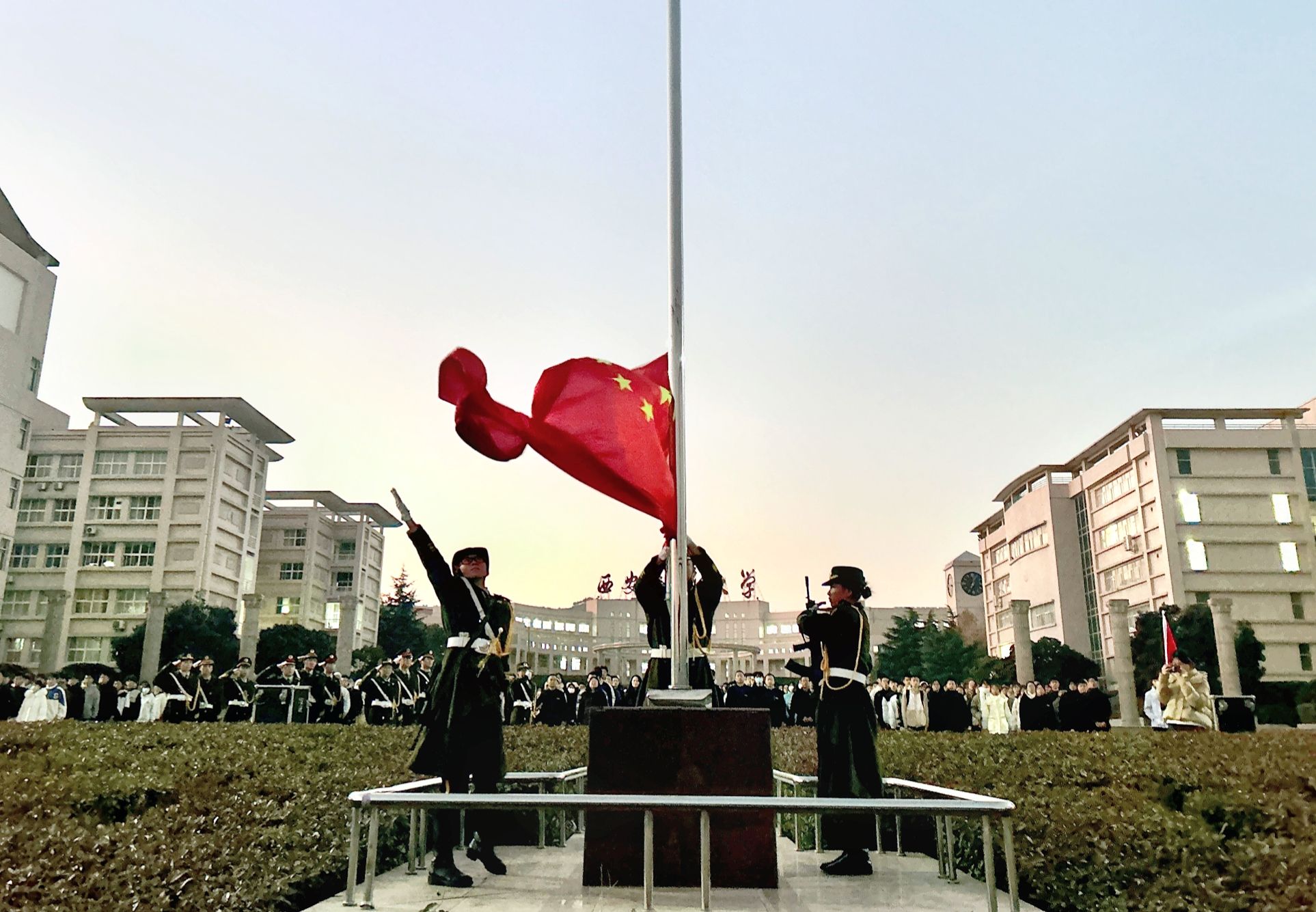 晨光熹微,寒风送冽。国旗护卫队队员身着挺拔制服,迈着铿锵有力的步伐,昂首阔步走向升旗台。伴随着《义勇军进行曲》激昂雄壮的旋律,五星红旗冉冉升起,全体师生肃立注目,齐唱国歌,爱国之情在每个人心中激荡。升旗仪式结束后,李珈亦以《以青春之智,筑科技强国之路》为题进行宣讲。