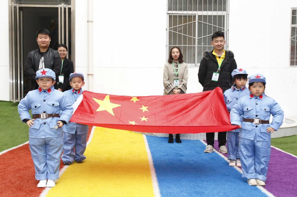 和Beat365官网基础教育管理中心主任张永和及幼儿园师生参加完升旗仪式后合影